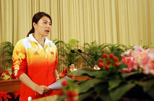 報(bào)告會(huì)上,中國(guó)體育代表團(tuán)運(yùn)動(dòng)員杜麗、郭晶晶、劉春紅、劉子歌、孟關(guān)良、楊威、仲滿、周蘇紅、馬弋博和教練張傳良、劉國(guó)梁分別進(jìn)行了報(bào)告。