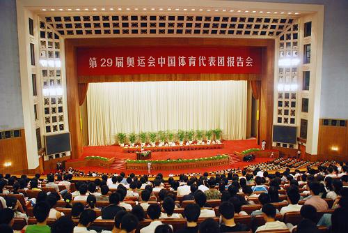 9月11日,第29屆奧運(yùn)會(huì)中國(guó)體育代表團(tuán)報(bào)告會(huì)在北京人民大會(huì)堂舉行。新華社發(fā)(楊慧峰 攝)