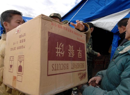 10月7日,救援人員在分發(fā)救災(zāi)物資。新華社記者 覺果 攝
