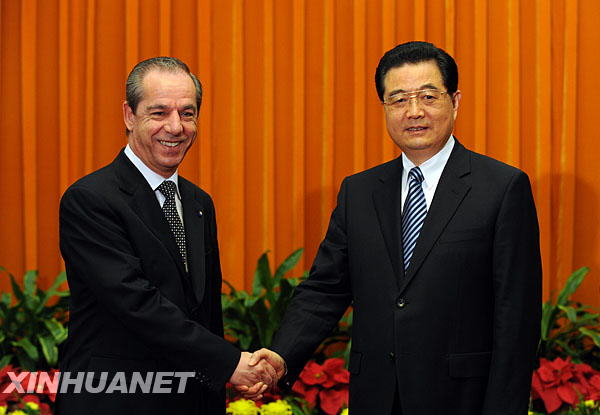 10月23日,中國國家主席胡錦濤在北京人民大會堂會見來華出席第七屆亞歐首腦會議的意大利總理貝盧斯科尼。 新華社記者劉衛兵攝