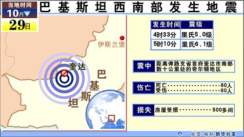 新華網(wǎng)北京10月29日電 國家主席胡錦濤29日就巴基斯坦俾路支省發(fā)生強烈地震造成重大人員傷亡和財產(chǎn)損失,向巴基斯坦總統(tǒng)扎爾達里致慰問電。