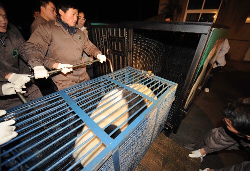 新華社快訊:“團團”“圓圓”吃完了在碧峰峽基地的最后一頓早餐——胡蘿卜和窩窩頭,已進入轉(zhuǎn)運籠。