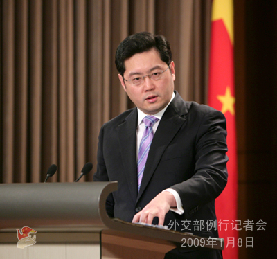 2009年1月8日下午,外交部發(fā)言人秦剛舉行例行記者會(huì),主要就中美關(guān)系、巴以沖突等答記者問。