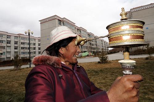1月6日,拉薩首批廉租房住戶白瑪老阿媽在院里搖動轉經筒。 據了解,2008年西藏自治區在拉薩市和其他6個地區建設了4564套廉租住房,部分城鎮低收入困難群眾住房條件得到改善。西藏目前的廉租住房制度主要針對國有企業住房困難職工和城鎮最低收入住房困難家庭,通過發放租賃住房補貼和實物配租兩種方式實施。西藏還將擴大廉租住房的受益人群和建設地區。從2009年到2010年末,西藏將逐步把廉租住房保障對象由目前的城鎮最低收入家庭擴大到城鎮低收入家庭。  新華社記者 覺果 攝