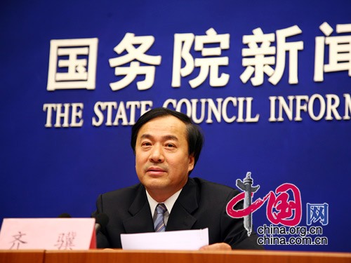 2009年1月6日10時,新聞辦公室舉行新聞發布會,請住房城鄉建設部副部長齊驥和發展改革委、財政部、人民銀行有關負責人介紹關于促進房地產市場健康發展的有關情況,并答記者問。圖為住房和城鄉建設部副部長齊驥介紹情況。