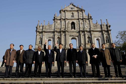 1月11日,國(guó)家副主席習(xí)近平到澳門(mén)著名文化遺址大三巴參觀。這是參觀后習(xí)近平與澳門(mén)特別行政區(qū)行政長(zhǎng)官何厚鏵(左五)等合影。新華社記者 周磊 攝