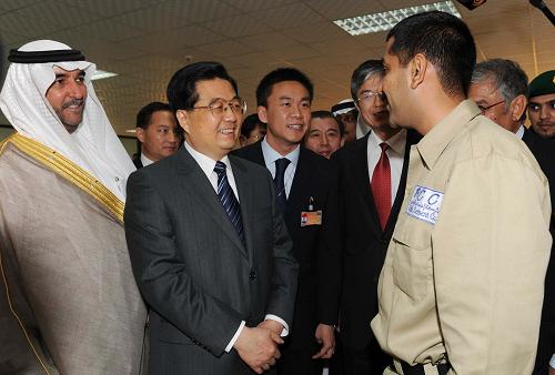 2月11日,正在沙特阿拉伯進行國事訪問的國家主席胡錦濤在利雅得參觀中沙經(jīng)濟和科技合作項目。這是胡錦濤主席在中國公司承建的利雅得水泥公司同沙方員工親切交談。 新華社記者 饒愛民 攝