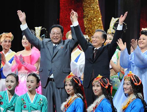 隨后,兩國(guó)總理和首都2000余名觀眾共同欣賞了由中國(guó)人民解放軍總政治部歌舞團(tuán)、歌劇團(tuán)、北京舞蹈學(xué)院,以及朝鮮萬(wàn)壽臺(tái)藝術(shù)團(tuán)、血海歌劇團(tuán)和國(guó)立民族藝術(shù)團(tuán)等中朝兩國(guó)國(guó)家級(jí)文藝團(tuán)體共同演出的“中朝友好年”開幕式演出《友誼頌》。兩國(guó)200多位藝術(shù)家的精彩表演博得了現(xiàn)場(chǎng)觀眾陣陣熱烈掌聲。