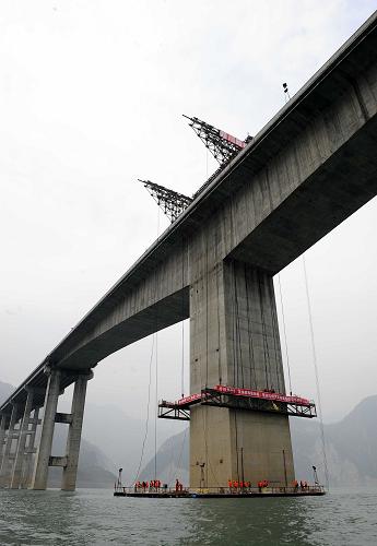 3月22日拍攝的廟子坪特大橋修補施工外景。當日,位于四川省紫坪鋪水庫的都汶公路廟子坪特大橋開始進行首次深水條件下的修補施工。橫跨紫坪鋪水庫的廟子坪大橋全長1436米,橋墩高100多米。汶川地震中,大橋從中間斷裂,橋墩出現裂縫。廟子坪大橋修復工程計劃于4月底全部結束,以保障都江堰至映秀高速公路于5月12日震發1周年之際恢復通車。 新華社記者 陳凱 攝