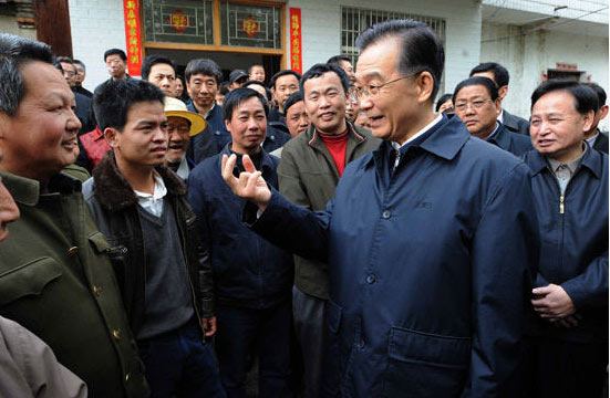 3月29日至31日,中共中央政治局常委、國務院總理溫家寶在湖北省考察。這是3月29日,溫家寶總理在仙桃市胡場鎮民三村與農民群眾交談。新華社記者馬占成攝