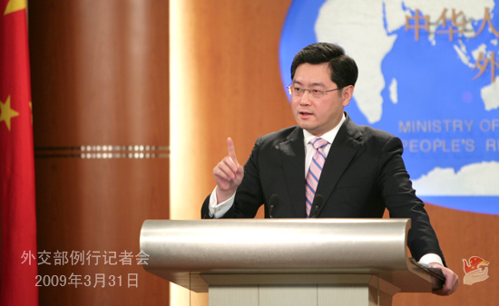 2009年3月31日下午,外交部發(fā)言人秦剛舉行例行記者會(huì),就朝鮮半島局勢(shì)、中法關(guān)系、中印關(guān)系、阿富汗問(wèn)題等答問(wèn)。
