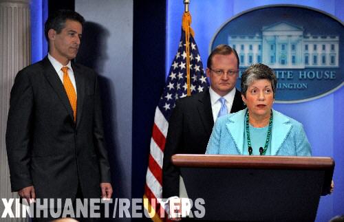 4月26日,在美國首都華盛頓,美國國土安全部長珍妮特·納波利塔諾(右)在新聞吹風會上講話。當日,白宮就美國出現人感染豬流感病例舉行新聞吹風會,宣布美國豬流感患者增至20人,美進入公共衛生緊急事態。美國國土安全部長珍妮特·納波利塔諾、美國疾病控制和預防中心代理主任理查德·貝塞爾(左)等出席了新聞吹風會。 新華社/路透