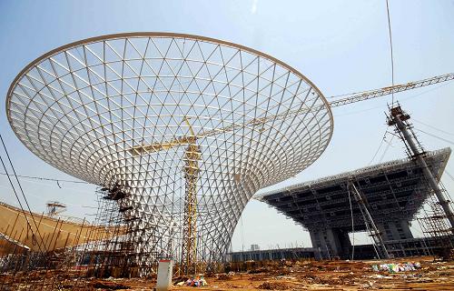 世博軸4號(hào)“陽(yáng)光谷”率先亮相,與中國(guó)館遙相呼應(yīng)(4月25日攝)。由6個(gè)巨型圓錐狀鋼結(jié)構(gòu)組成的世博軸“陽(yáng)光谷”,將于今年上半年全部亮相。“陽(yáng)光谷”采用鋼結(jié)構(gòu),讓自然光傾瀉而下,滿(mǎn)足部分地下空間的采光,體現(xiàn)環(huán)保、節(jié)約辦世博的理念。新華社發(fā)