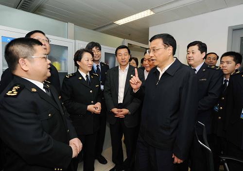 4月29日,中共中央政治局常委、國務(wù)院副總理李克強在北京首都國際機場、中國疾病預(yù)防控制中心考察人感染豬流感防控工作。這是李克強在首都國際機場3號航站樓與海關(guān)人員交談。新華社記者饒愛民攝