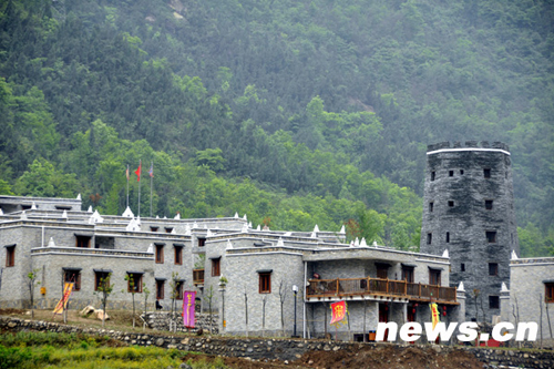 5月9日,“吉娜”新羌寨全貌。在去年5.12特大地震中遭受嚴重破壞的北川擂鼓鎮(zhèn)貓兒石村“吉娜”羌寨,在山東省濟南市對口援建下,從廢墟上拔地而起,69戶原“吉娜”羌寨居民今年春節(jié)前重新搬回新寨,遷入新居。新華網(wǎng) 前衛(wèi) 攝