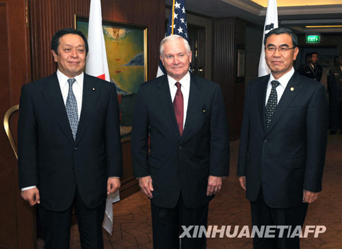 5月30日,美國國防部長蓋茨(中)、日本防衛(wèi)大臣濱田靖一(左)以及韓國國防部長官李相熹在新加坡就朝鮮半島局勢發(fā)展舉行會晤。美日韓國防部長當日在新加坡表示,朝鮮半島核問題對地區(qū)和平與安全構成了威脅,三國將加強彼此之間的合作,并與其他國家一道致力于解決這一問題。新華社/法新