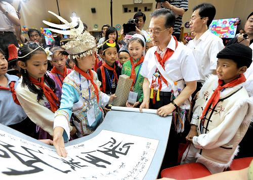 這是一位少數(shù)民族少年兒童向溫家寶贈(zèng)送書(shū)法作品。新華社記者 馬占成 攝