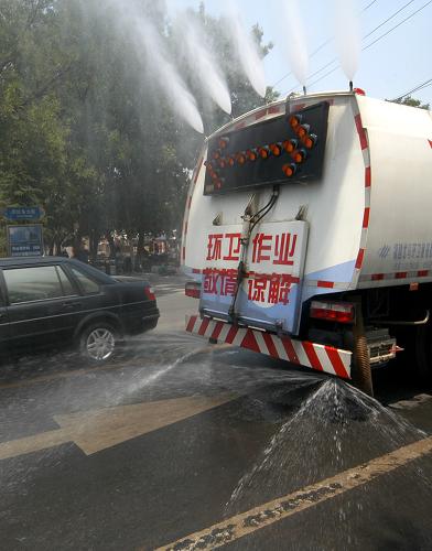 6月24日,在河北省邢臺市街頭,環衛灑水車上路作業,給道路灑水降溫。當日,河北省邢臺市最高氣溫超過40攝氏度,省氣象臺17時發布今年首個高溫紅色預警,提醒人們注意做好防暑降溫和預防火災的工作。新華社發(黃濤 攝)