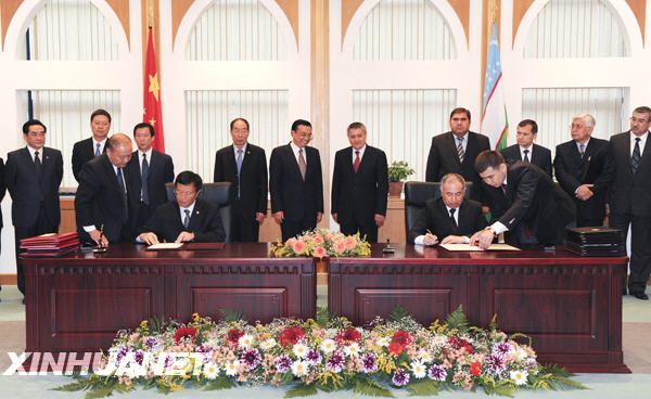 6月27日,中國國務院副總理李克強在塔什干與烏茲別克斯坦第一副總理阿齊莫夫舉行會談。會談結束后,李克強與阿齊莫夫共同出席兩國在能源、經貿、旅游、醫療等領域11份合作文件的簽字儀式。新華社記者李學仁攝