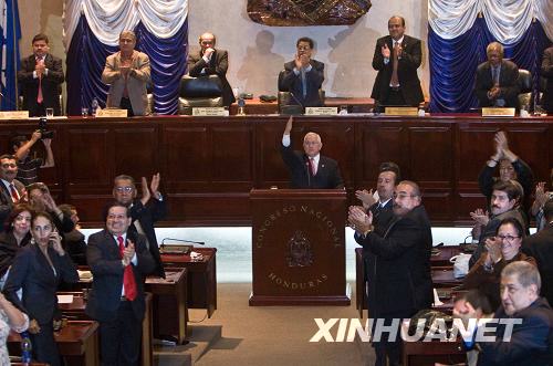 6月28日,洪都拉斯議會(huì)議長羅伯托·米凱萊蒂(中)在首都特古西加爾巴宣誓就任該國臨時(shí)總統(tǒng)后向議會(huì)其他成員致意。洪都拉斯議會(huì)在當(dāng)天舉行的緊急會(huì)議上經(jīng)過磋商和激烈辯論,通過了由議長米凱萊蒂出任國家臨時(shí)總統(tǒng)的決議。 新華社發(fā)(戴維攝)