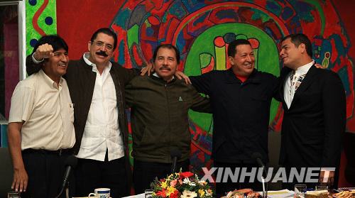委內(nèi)瑞拉總統(tǒng)查韋斯、厄瓜多爾總統(tǒng)科雷亞、尼加拉瓜總統(tǒng)奧爾特加、剛經(jīng)歷政變的洪都拉斯總統(tǒng)塞拉亞以及古巴外長布魯諾出席了本次會(huì)議。