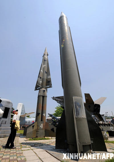 這張5月27日拍攝的資料照片顯示,一名韓國人在首都首爾觀看一枚朝鮮導彈(右)和一些韓國導彈的模型。新華社/法新