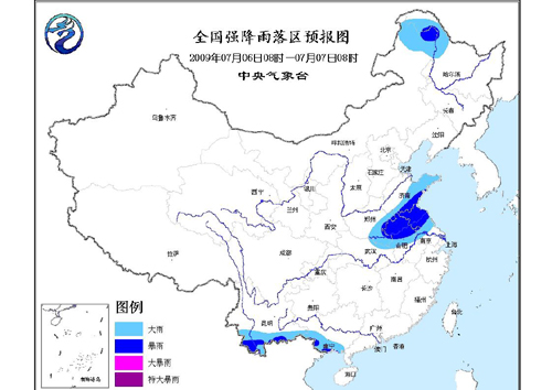 6日08時至7日08時,新疆北部、青藏高原中東部、甘肅南部、內蒙古東部、東北大部、華北東部、黃淮、江淮、江漢、江南西部和北部、華南大部、西南地區等地有小到中雨或陣雨,其中,內蒙古東北部、黑龍江西北部、山東南部和東部、河南南部、蘇皖中北部、云南南部、廣西南部等地的部分地區有大雨,云南南部、廣西西南部、蘇皖北部、山東南部、內蒙古東北部等地的局部地區有暴雨,降水量約有50~90毫米。內蒙古東部、黑龍江、吉林西部、遼寧西部、河北大部、北京、天津、青海大部、陜西東南部、山西南部、河南大部、山東大部、西藏東部、四川西部、重慶東部、湖北、安徽、江蘇、上海、云南、貴州東部、湖南、江西、浙江、福建、廣西、廣東與海南北部等地將有雷暴天氣,其中內蒙古東部、黑龍江西南部、吉林西部、遼寧西部、河北北部、北京北部、河南東南部、安徽大部、江蘇大部、江西中北部、浙江中東部、云南南部與廣西西南部等地有冰雹雷雨大風或短時強降水等強對流天氣。內蒙古中東部、東北大部、華北北部等地有4~6級偏北或偏南風。黃海中部海域將有7~8級、陣風9級的大風,黃海南部海域將有6-8級偏南風。