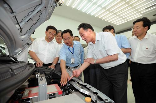 7月2日至7日,中共中央政治局常委、全國人大常委會委員長吳邦國在安徽調(diào)研。這是吳邦國在奇瑞集團(tuán)汽車研究院觀看新能源汽車展示。新華社記者李濤攝