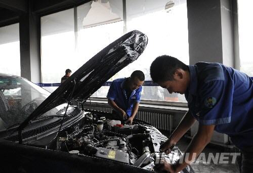 7月15日,新疆通通商貿公司4S店工作人員在維修客戶送修的汽車。 位于烏魯木齊市天山區大灣南路的新疆通通商貿有限公司,在“7·5”事件中損失慘重。近日來,在社會各界和政府部門的關心和幫助下,新疆通通商貿有限公司被毀店面已恢復正常營業。 新華社記者陳樹根攝