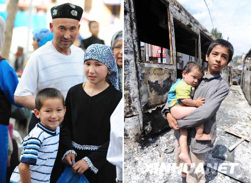 左圖:7月4日,一名男孩和家人在烏魯木齊二道橋逛街。 新華社記者 魯煒攝 右圖:7月6日,在烏魯木齊市北灣街,被大火焚燒的汽車旁,一位少年緊緊抱著一名受到驚嚇的嬰兒。 新華社記者 沙達提 攝