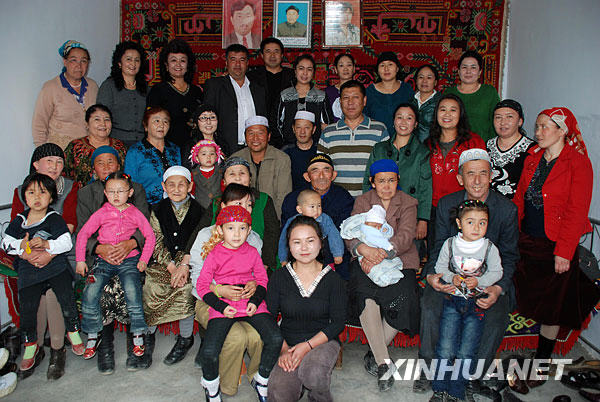 這是近年拍攝的阿尼帕的家庭聚會。7月的新疆阿勒泰草原上鮮花盛開,新疆首屆十大杰出母親阿尼帕含辛茹苦收養漢、回、維吾爾、哈薩克4個民族10個孤兒的事跡傳遍了天山南北。加上自己親生的9個兒女,70歲的阿尼帕老人和她這個民族團結的大家庭,已有維吾爾、漢、回、哈薩克、塔塔爾、烏茲別克6個民族的180多口人,他們的故事感動了2000多萬新疆各族人民。新華社記者徐軍峰攝