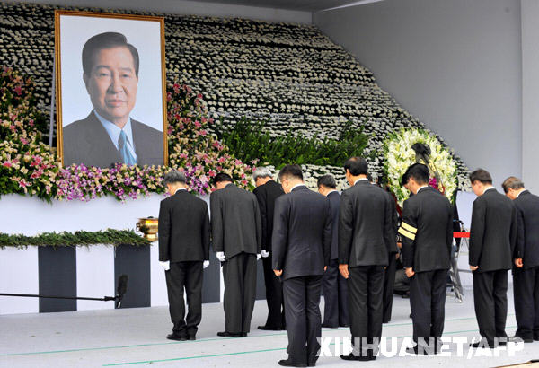 8月21日,在韓國首都首爾設在國會的已故前總統(tǒng)金大中的正式靈堂,由朝鮮勞動黨中央書記金己男(中)率領(lǐng)的朝鮮吊唁團吊唁韓國前總統(tǒng)金大中。新華社/法新