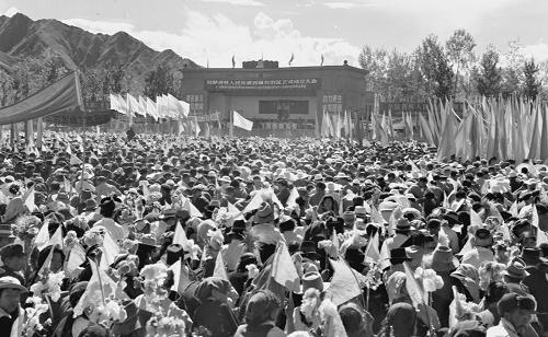 1965年9月,拉薩各界各族人民3萬多人舉行集會游行,熱烈慶祝西藏自治區(qū)成立(資料照片)。新華社 發(fā)