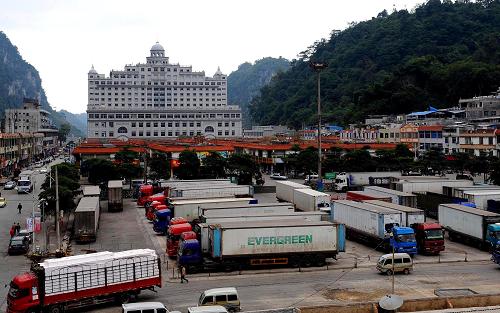 2008年11月19日,來自中國各地和越南的大型貨車在廣西憑祥口岸浦寨貿(mào)易區(qū)等待交易(資料照片)。新華社記者 劉廣銘 攝