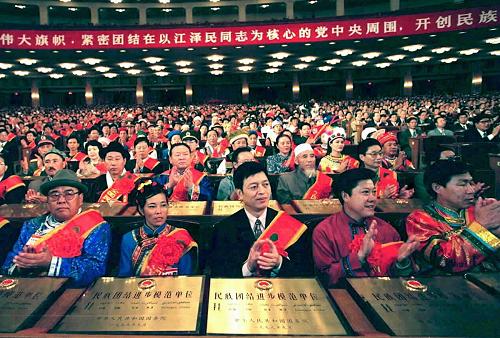 1999年9月29日,中央民族工作會議開幕式暨國務(wù)院第三次全國民族團(tuán)結(jié)進(jìn)步表彰大會在北京人民大會堂舉行。1254個(gè)民族團(tuán)結(jié)進(jìn)步模范集體和個(gè)人受到表彰(資料照片)。新華社記者 劉建生 攝