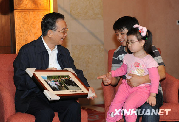 9月25日,中共中央政治局常委、國務(wù)院總理溫家寶在綿陽邀請四川地震災(zāi)區(qū)部分基層干部群眾會面。這是溫家寶親切地拉著在北川中學(xué)初中一年級讀書的羌族小女孩劉小樺的手,詢問她的學(xué)習(xí)和生活情況。新華社記者黃敬文攝