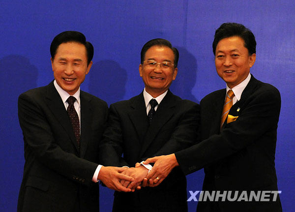 10月10日,第二次中日韓領導人會議在北京人民大會堂舉行。中國國務院總理溫家寶主持會議。韓國總統李明博、日本首相鳩山由紀夫出席會議。這是會議正式開始前,溫家寶、李明博和鳩山由紀夫在人民大會堂握手合影。新華社記者黃敬文攝