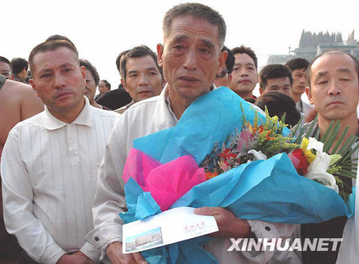 10月26日,參與救助落水大學生的61歲寶塔灣冬泳隊老隊員魯德忠接過學生們致謝的鮮花后潸然淚下。新華社記者 魏夢佳 攝