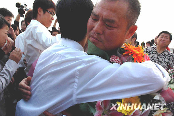 10月26日,長江大學學生與參與救助落水同學的寶塔灣冬泳隊老隊員擁抱以感謝他們的義舉。新華社記者 魏夢佳 攝