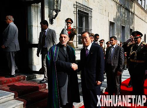 11月2日,阿富汗總統(tǒng)卡爾扎伊(前左)在喀布爾歡迎到訪的聯(lián)合國秘書長潘基文。當(dāng)日,阿富汗獨(dú)立選舉委員會(huì)宣布,阿總統(tǒng)選舉第二輪投票不再舉行,現(xiàn)任總統(tǒng)卡爾扎伊獲勝當(dāng)選阿總統(tǒng)。新華社/美聯(lián)