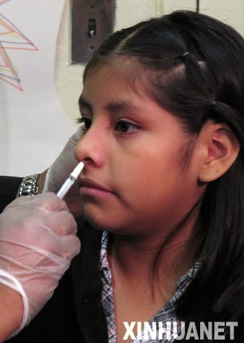 2009年10月28日,在美國紐約布魯克林區的第157公立小學,一名學生正在接種甲型流感疫苗鼻腔噴劑。新華社記者劉欣攝