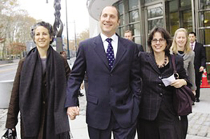 馬修·坦。ㄗ螅┖屠瓲柗-喬菲興高采烈走出法庭。