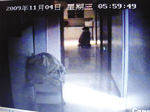 監控錄像拍攝的徐寶寶母親跪在醫生辦公室前的場景。