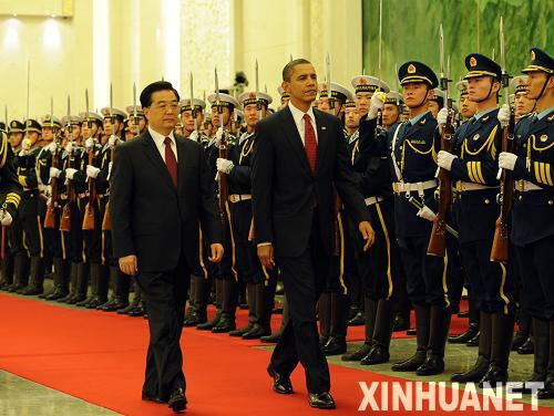 11月17日,國家主席胡錦濤在北京人民大會堂主持儀式,歡迎美國總統(tǒng)奧巴馬訪華。新華社記者 李濤 攝