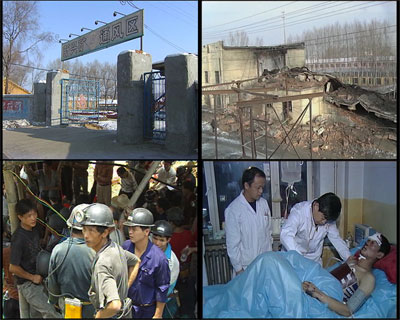 11月21號(hào)夜里十點(diǎn),記者趕到了黑龍江省鶴崗市新興煤礦,這里就是礦難發(fā)生的現(xiàn)場(chǎng),房屋在巨大的外力作用下已經(jīng)全部倒塌,崩裂。雖然距災(zāi)難發(fā)生已經(jīng)過(guò)去了二十個(gè)小時(shí),但濃重的水汽仍然從塌陷的地面里不斷涌出,直上藍(lán)天。憑記者目測(cè),幾百平方米范圍內(nèi)的建筑都受到了明顯破壞,斷裂的水泥塊、墻體觸目皆是。知情人透露,這里原本是一處井口,建有十幾米高的樓房,如今已基本被夷為平地。現(xiàn)場(chǎng)空無(wú)一人,沒(méi)有采取任何防護(hù)和保護(hù)措施。在多方打聽(tīng)后,在距房屋倒塌現(xiàn)場(chǎng)兩公里左右的地方,記者找到了事故搜救現(xiàn)場(chǎng),這里是新興煤礦的另一處井口,搶險(xiǎn)和搜救人員從這里進(jìn)入井下實(shí)施搶險(xiǎn)。在井口所處的休息室里,這幾名工作人員正在值班,協(xié)助搶險(xiǎn)搜救工作。