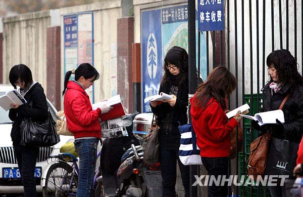 11月29日,考生在上海徐匯區(qū)零陵中學(xué)考點(diǎn)外抓緊時間看書復(fù)習(xí)。當(dāng)日,2010年度中央機(jī)關(guān)及其直屬機(jī)構(gòu)公務(wù)員錄用考試公共科目筆試在全國各省會城市、自治區(qū)首府、直轄市和部分較大的城市同時舉行,預(yù)計將有100萬人參加考試。2010年度中央機(jī)關(guān)及其直屬機(jī)構(gòu)公務(wù)員錄用考試,共有130多個中央機(jī)關(guān)及其直屬機(jī)構(gòu)和參照公務(wù)員法管理的單位面向社會公開招考,計劃招收1.5萬余人。新華社記者 劉穎 攝