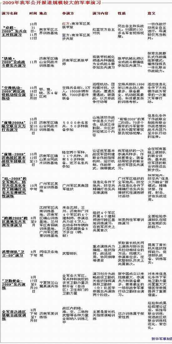 據(jù)新華軍事的不完全統(tǒng)計(jì),截至2009年11月30日,今年以來(lái)經(jīng)權(quán)威媒體公開(kāi)報(bào)道的較大規(guī)模的中國(guó)軍隊(duì)參與的軍事和非軍事演習(xí)(練)就有18次。其中如"跨越2009"跨區(qū)基地實(shí)兵系列軍事演習(xí)更是受到了媒體的重點(diǎn)關(guān)注,曝光率極高。媒體報(bào)道的內(nèi)容很非常的寬泛,從行軍過(guò)程,到士兵裝具的變化,再到演習(xí)過(guò)程的記者目擊,讀者通過(guò)這些報(bào)道可以了解到演習(xí)的很多細(xì)節(jié)。