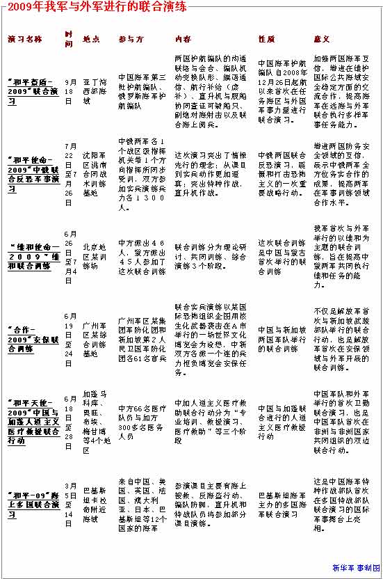 此外,今年中國(guó)軍隊(duì)還參與了6次中外聯(lián)合軍事演練(習(xí))。其中有多個(gè)"首次"--中國(guó)特種部隊(duì)首次亮相國(guó)際軍演舞臺(tái),中國(guó)軍隊(duì)首次與外軍進(jìn)行衛(wèi)勤聯(lián)合演練,解放軍首次與外軍進(jìn)行安保領(lǐng)域聯(lián)合訓(xùn)練,我軍與外軍的首次維和聯(lián)合訓(xùn)練。聯(lián)合演習(xí)中的重頭戲是,"和平使命-2009"中俄聯(lián)合反恐軍事演習(xí)。