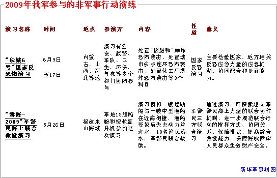 2009年中國(guó)軍隊(duì)參與了一些非軍事行動(dòng)演練,規(guī)模較大的有"長(zhǎng)城6號(hào)"國(guó)家反恐怖演習(xí)和"鷺海-2009"軍警民海上聯(lián)合救援演習(xí)。