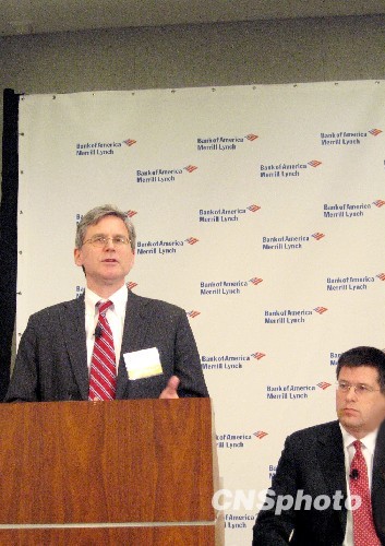 美國銀行/美林公司14日宣布其全球經濟研究結果稱,全球經濟在2010年將開始“緩慢而穩定”的復蘇。圖為美國銀行北美首席經濟學家伊桑·哈里斯(左)在發布會上。 中新社發 魏晞 攝